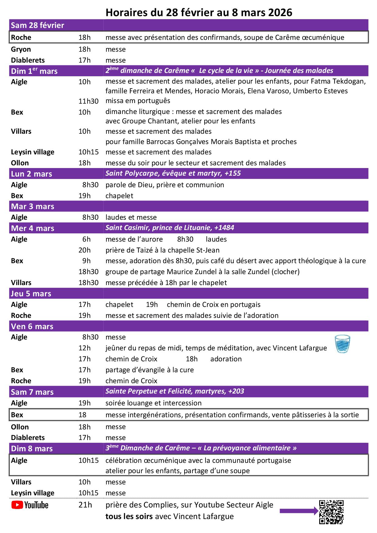 Dans toutes les paroisses du Secteur d’Aigle, un programme riche en rencontres, en temps forts et en célébrations s’offre à vous : partager – se priver – prier sont les trois dimensions traditionnelles du Carême.