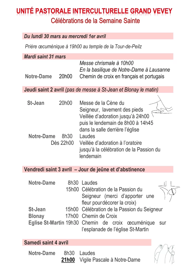 Les personnes intéressées peuvent prendre contact avec un prêtre ou un agent pastoral de la paroisse ou peuvent appeler le secrétariat de St-Jean 021 925 88 10 ou paroisse.vevey.st-jean@cath-vd.ch.
