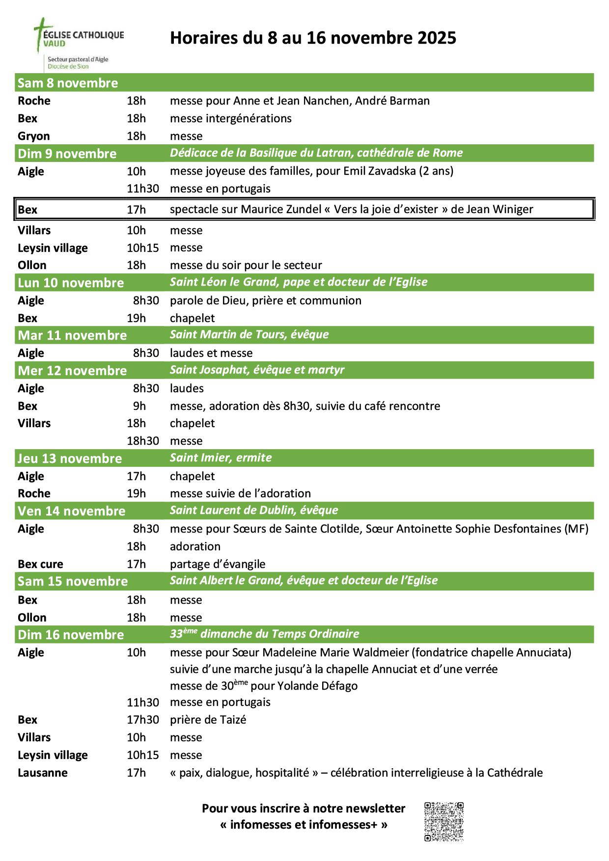 Découvrez et inscrivez-vous à Infomesses, notre journal paroissial en ligne ! formulaire infomesses ou envoyez un mail à infomesses.aigle@cath-vd.ch