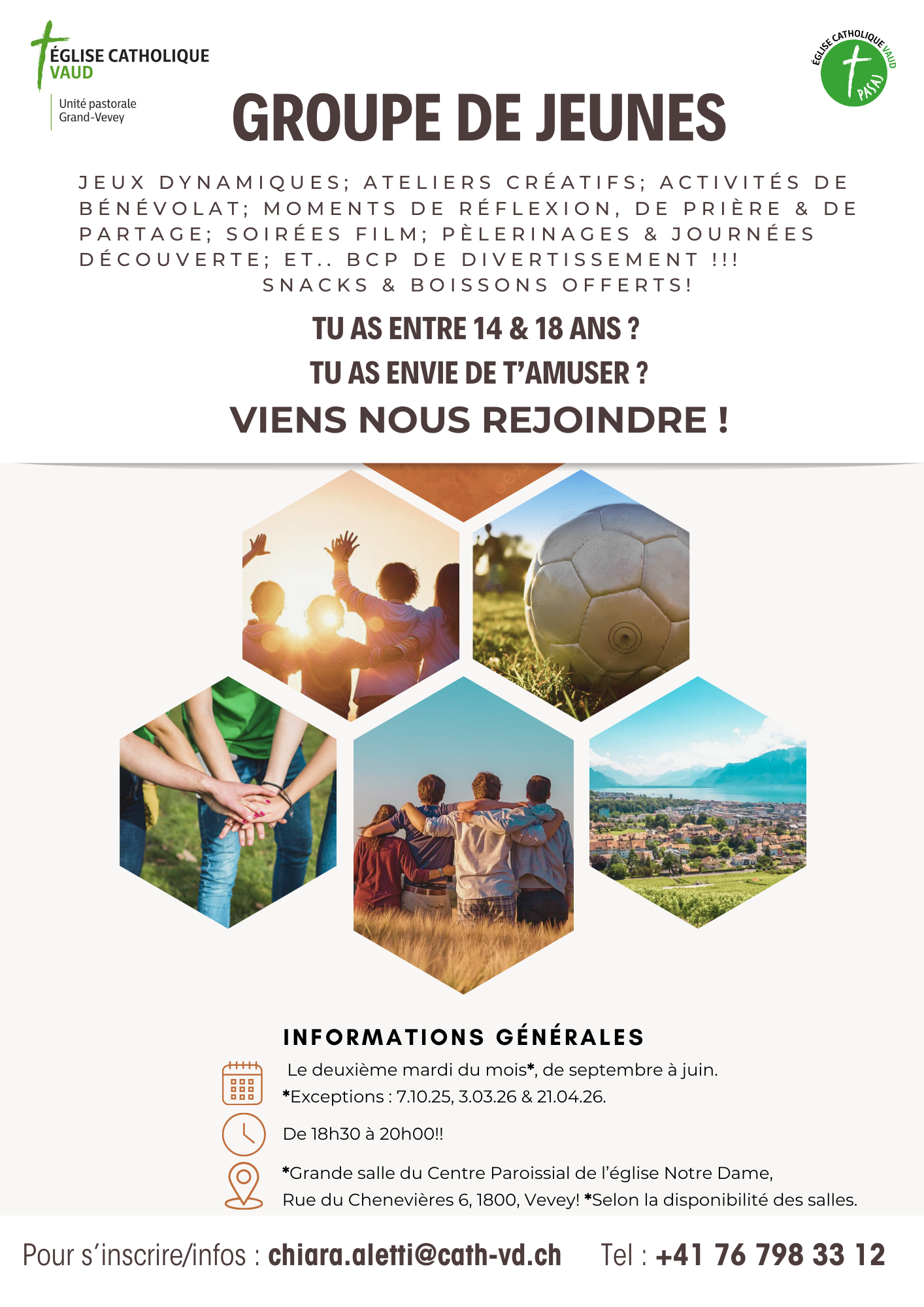 Bienvenue au groupe des jeunes 14-18 ans qui se rencontre les 2è mardis du mois, à la paroisse de l'église Notre-Dame de Vevey.