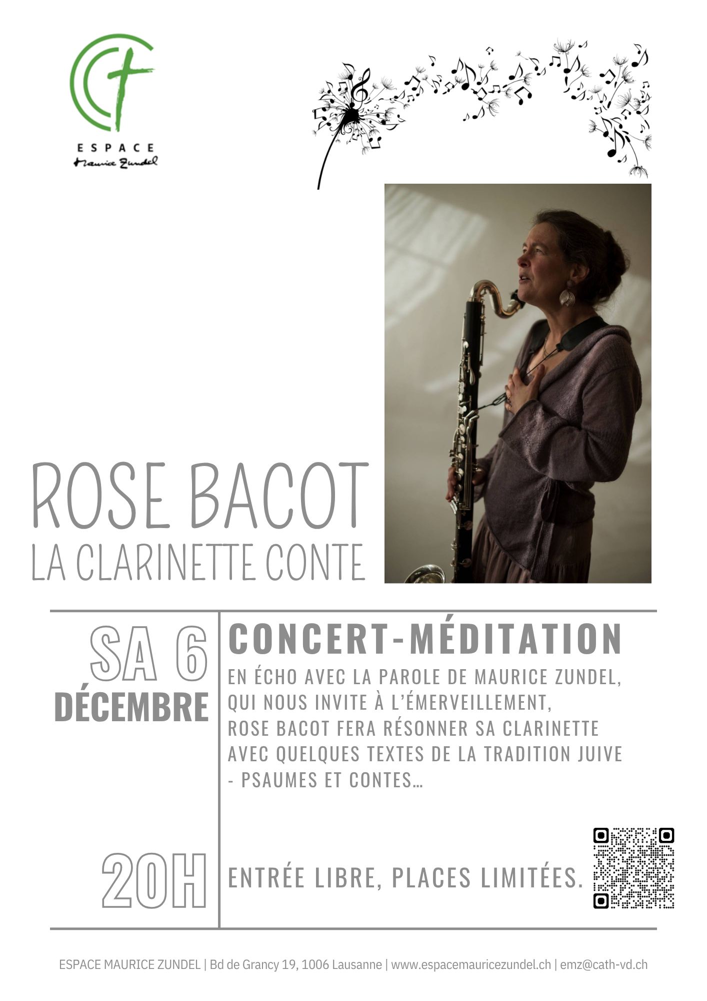 En écho avec la parole de Maurice Zundel, qui nous invite à l’émerveillement, Rose Bacot fera résonner sa clarinette avec quelques textes de la tradition juive - psaumes et contes…