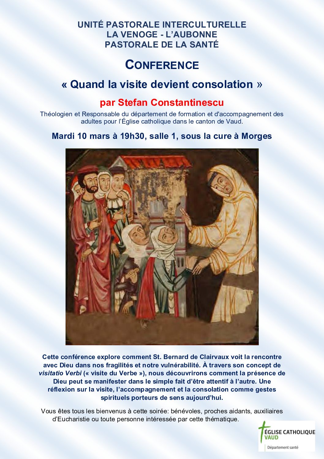 L'unité pastorale interculturelle La Venoge - L'Aubonne et la pastorale de la santé de l'Eglise catholique dans le canton de Vaud proposent une conférence sur le thème « Quand la visite devient consolation » présentée par Stefan Constantinescu, théologien et responsable du département de formation et d'accompagnement des adultes pour l’Église catholique dans le canton de Vaud.