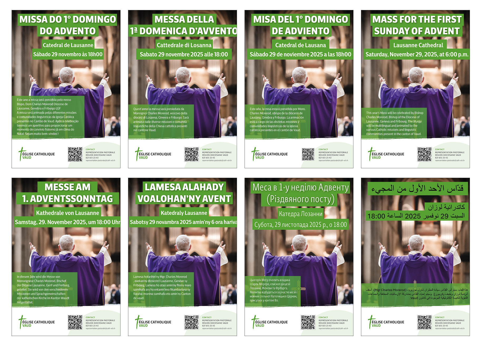 Cette année, la messe sera célébrée le samedi 29 novembre à 18h par Monseigneur Charles Morerod, évêque du diocèse de Lausanne, Genève et Fribourg. Elle sera plurilingue* et animée par les différentes missions et communautés linguistiques de l’Eglise catholique présentes dans le canton de Vaud.