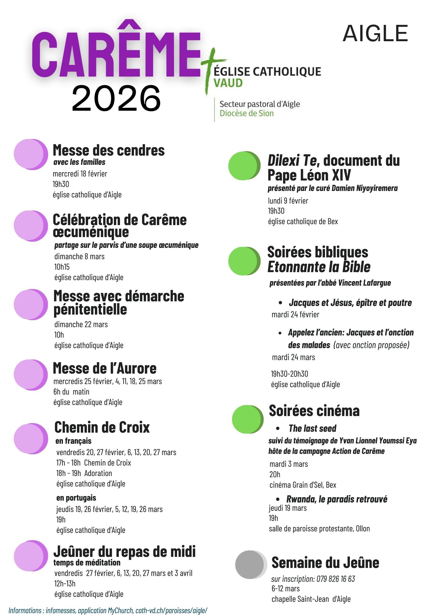 Dans toutes les paroisses du Secteur d’Aigle, un programme riche en rencontres, en temps forts et en célébrations s’offre à vous : partager – se priver – prier sont les trois dimensions traditionnelles du Carême.