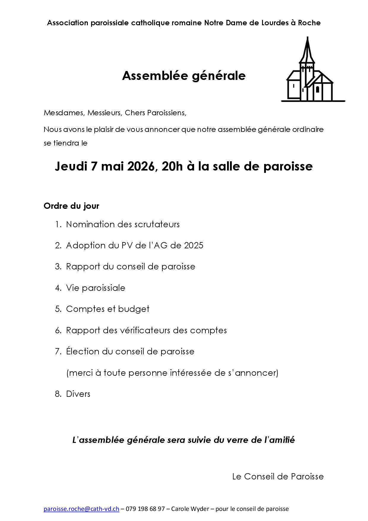 Adresse de la paroisse : rue du St-Bernard 13 1852 Roche, Adresse du secrétariat : rue du Rhône 4 1860 Aigle
