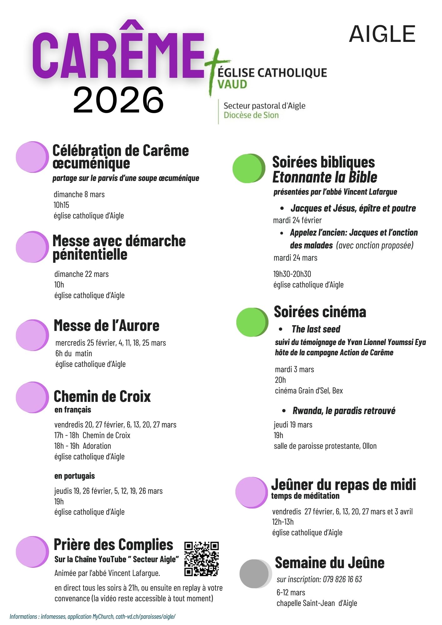 Dans toutes les paroisses du Secteur d’Aigle, un programme riche en rencontres, en temps forts et en célébrations s’offre à vous : partager – se priver – prier sont les trois dimensions traditionnelles du Carême.