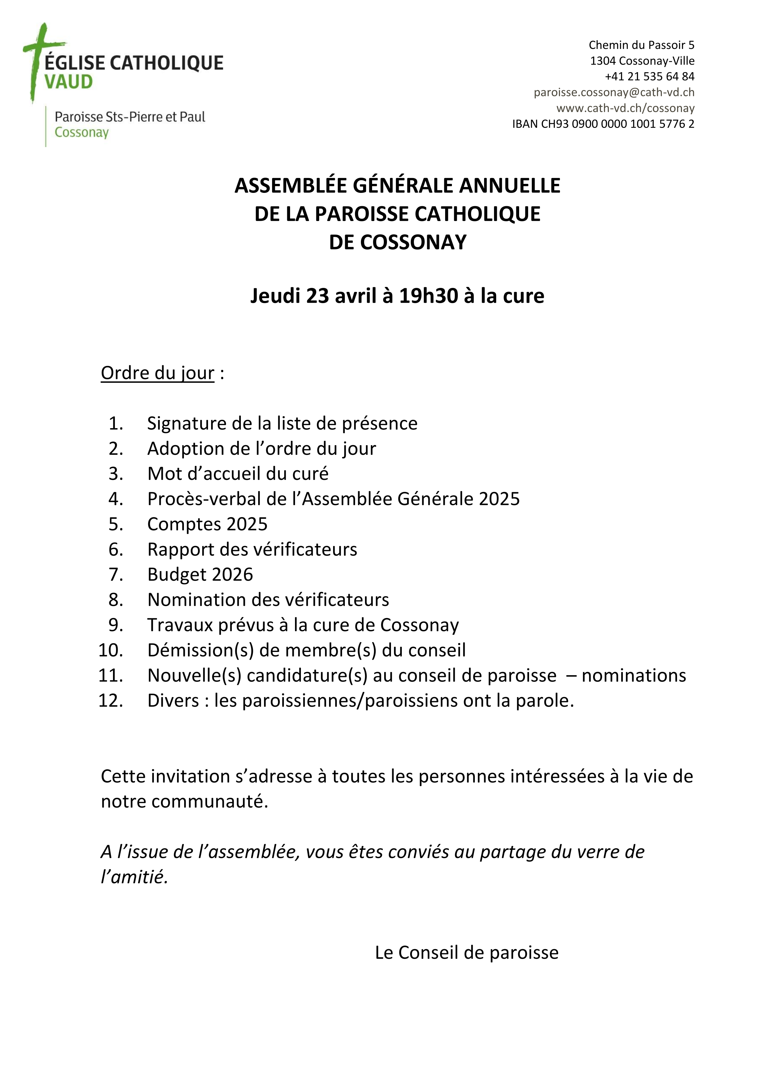 L’assemblée générale de la paroisse a lieu une fois par année, en règle générale au printemps. Elle est ouverte à tout paroissien.